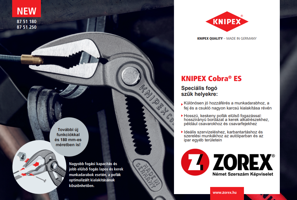 KNIPEX Cső- és vízpumpafogó Cobra®ES, keskeny fejforma, 250mm, bliszteres, 87 51 250 SB