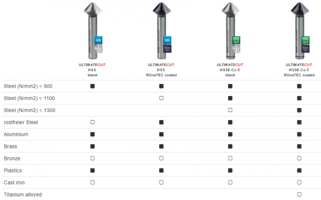 A Ruko ULTIMATECUT süllyesztőiből bevonatos és bevonat nélküli variáció is kapható HSS és HSS-Co 5 kivitelben. A négyféle variánst a következő anyagok megmunkálásához ajánljuk: