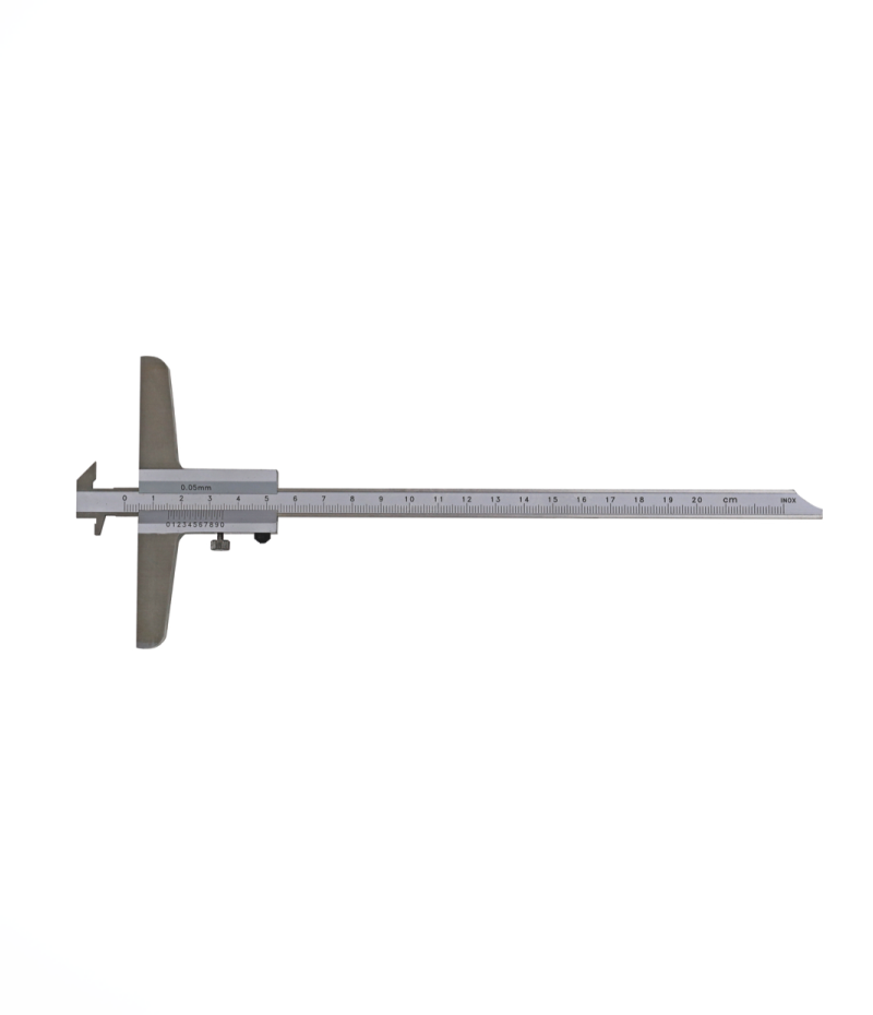 MIB német gyártmányú rozsdamentes, analóg mélységmérő a precíz, pontos mérésekhez. Csavarrögzítéses, matt-krómozott, dupla horoggal. Nóniusz skálás. DIN 862 szabvány. Mm mérési lehetőség. Bőrtokban szállítva.