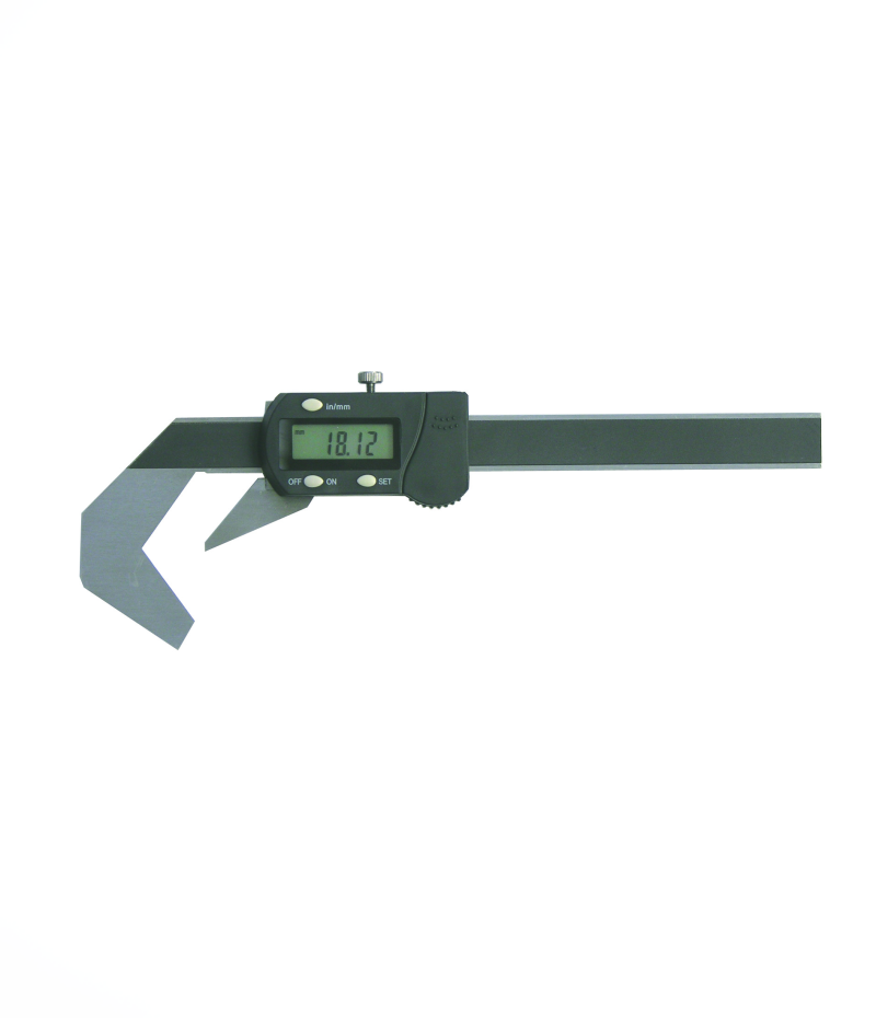 MIB német gyártmányú precíz, speciális, digitális tolómérő három élű szerszámok méréséhez, rozsdamentes, edzett acélból. Prizmás. Műanyag dobozban.