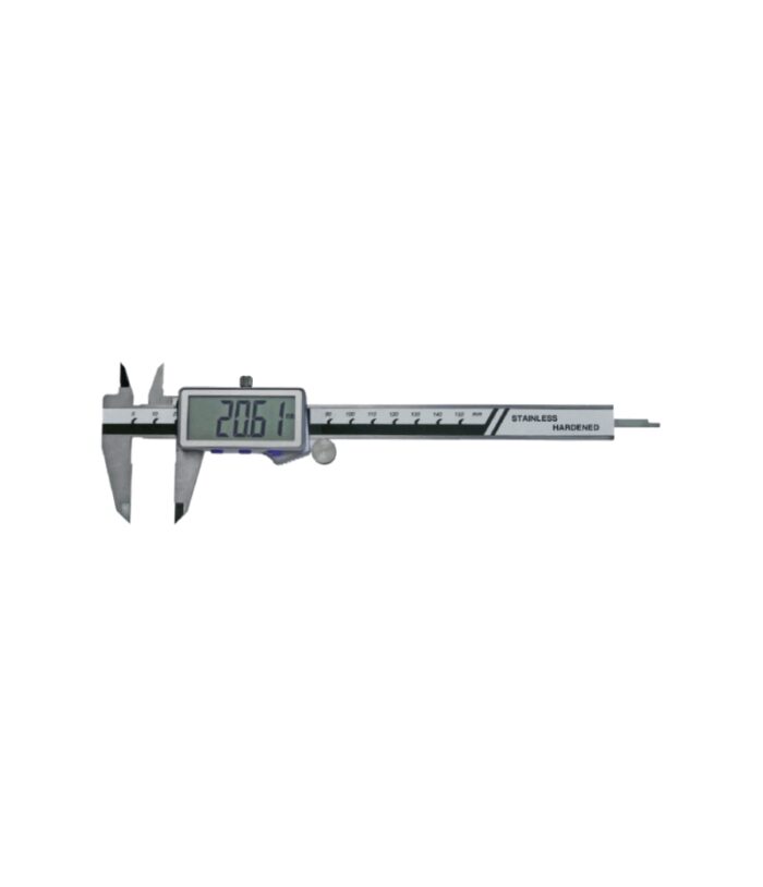 Rozsdamentes, edzett acélból készült tolómérő. Négyféle mérési lehetőség. 17 mm-es számmagasság a kijelzőn. Mérési tartomány: 150 mm. Pontosság: 0,03 mm. Olvasás: 0,01 mm vagy 0,0005″. Digitális: mm/hüvelyk és on/off gomb funkció.