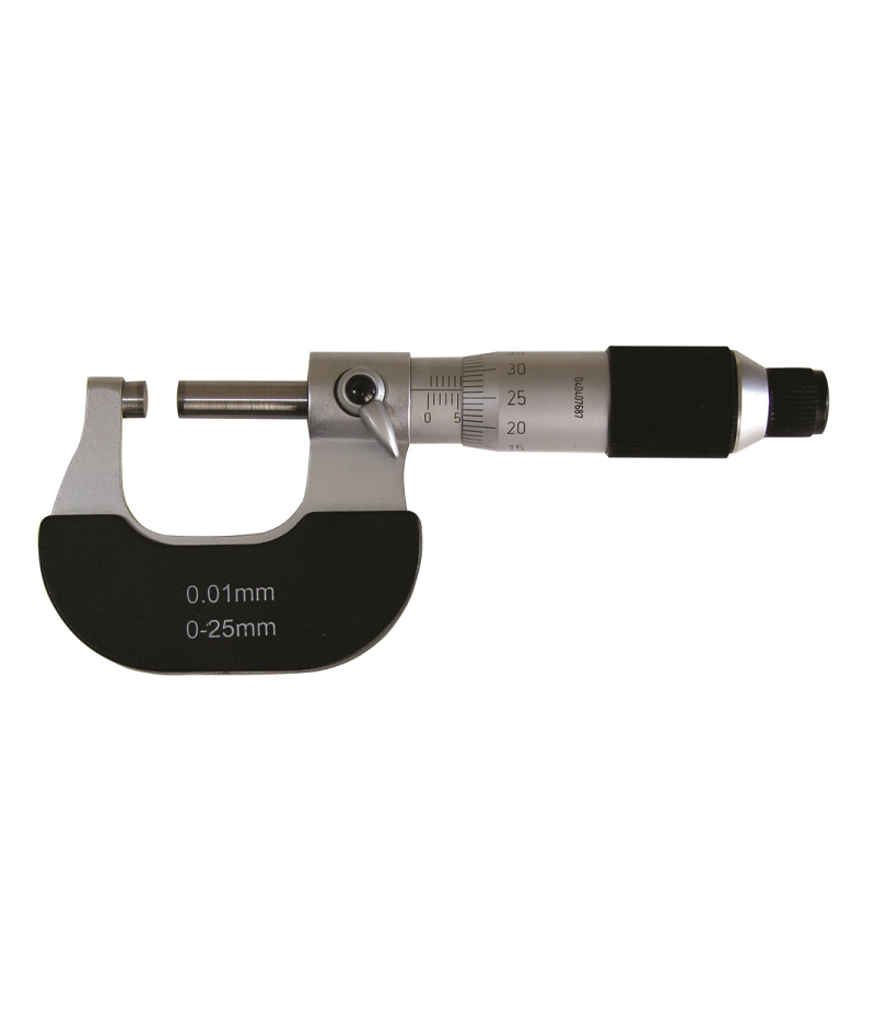 Külső mikrométer DIN863-as szabvány szerint gyártva. Karbid mérőfelületek, mérődob krómozott. A mérőorsó átmérője 6.5 mm, menetemelkedés 0.5 mm. Leolvasása 0.01 mm. Súrlódásgátló racsnival. Dobozban szállítva.