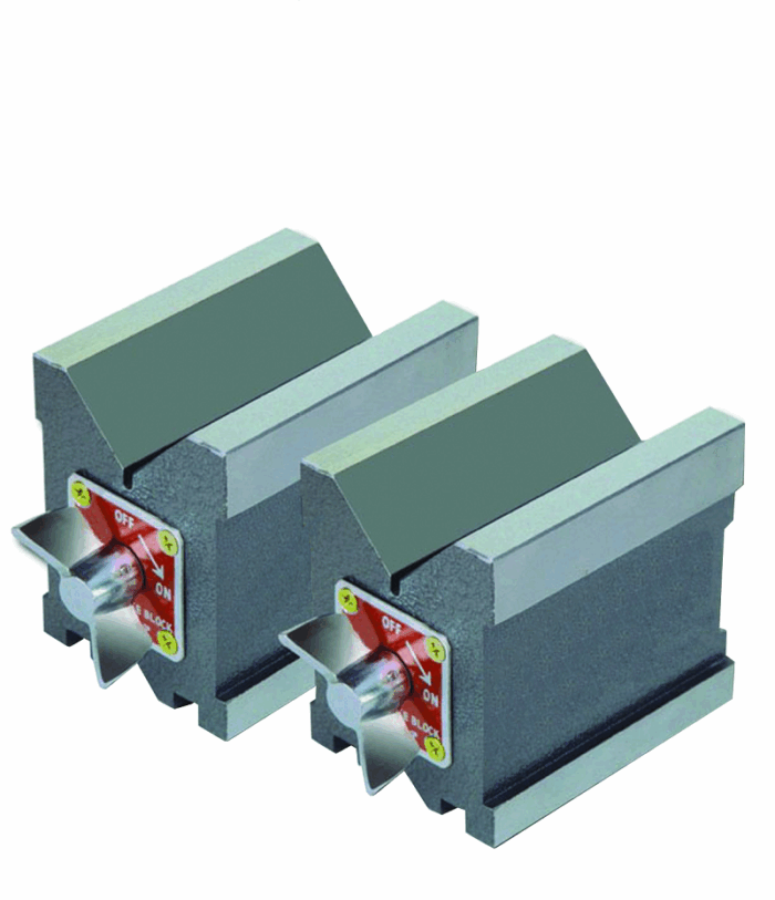 MIB német gyártmányú Mágneses V-prizma pár, DIN 876/1, speciális edzett acélból, 0,01 mm pontosság. A mágnes ki-be kapcsolható. Mágnes erősség 100 kg.