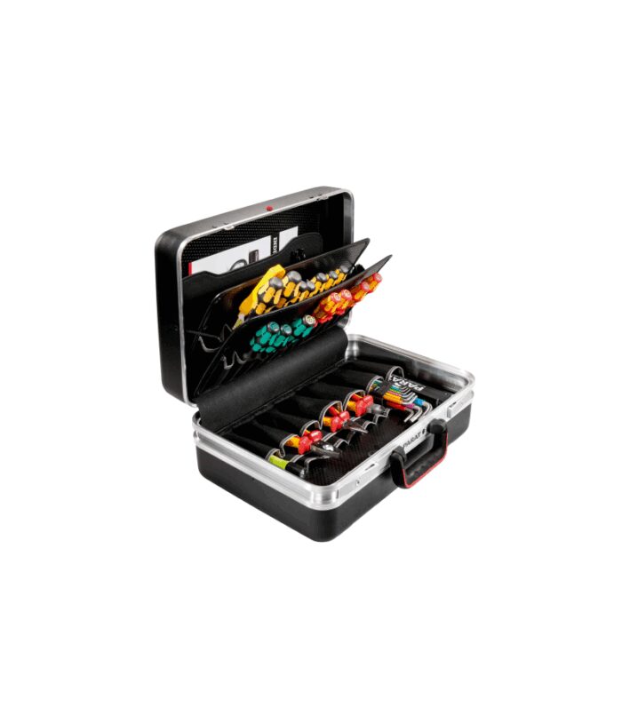 1 25 zsebes szerszámtartó lap, 1 behúzható 400 mm-es rekesszel. 1 10 zsebes fedélpanel, 1 behúzható 400 mm-es rekesszel. Alsó tálca fedélpanel, melynek magassága 58 mm és amely szabadon elválasztható. A fedélben dokumentumtartót található. 2 zseb névjegykártyákhoz optimalizálva. 2 ceruzatartó. Külső méretek: (W x H x D): 48,00 x 36,00 x 21,00 cm. Belső méretek: (W x H x D): 46,00 x 31,00 x 19,00 cm. Megfelel a légiközlekedés feltételeinek. Súly: 4,6 kg. Anyag: Con-Pearl®, X-ABS műanyag.