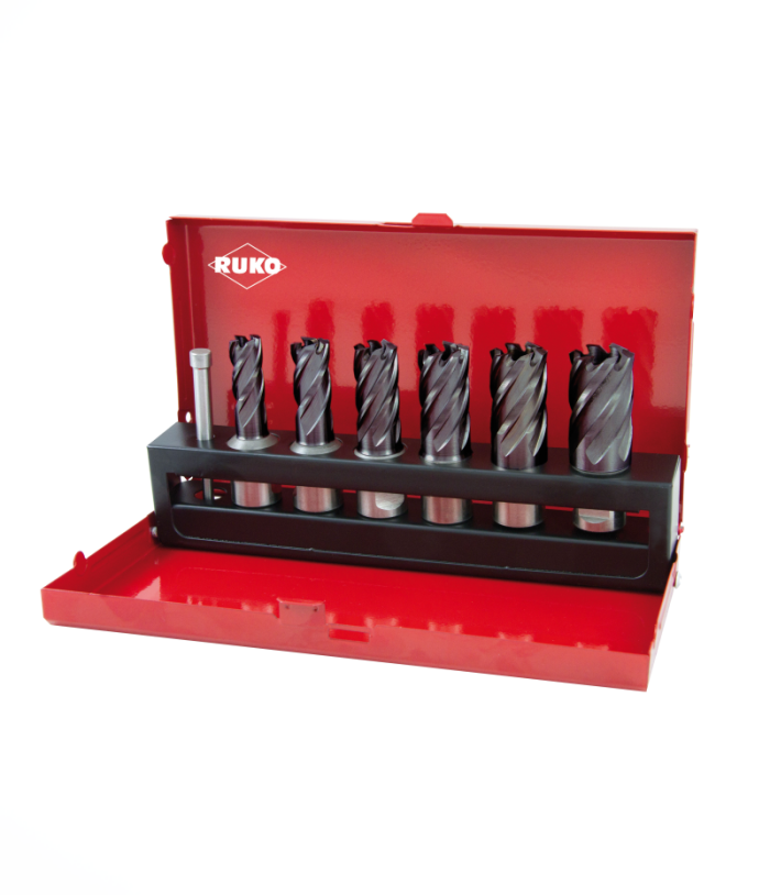 Ruko 6+1 részes magfúró készlet Weldon szárral (3/4″), HSS-TiAIN, fúrásmélység 30 mm, Ø 12 mm-14 mm-16 mm-18 mm-20 mm-22 mm, 108820F