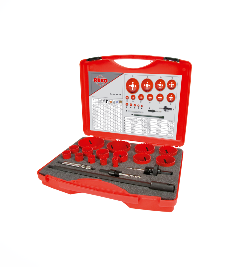 Ruko bimetál körkivágó, lyukfűrész, koronafúró, harangfúró 15+4 részes készlet, HSS, változó fogazással, fúrásmélység 38 mm, Ø 16,0 – 19,0 – 21,0 – 24,0 – 25,0 – 29,0 – 32,0 – 37,0 – 40,0 – 48,0 – 51,0 – 54,0 – 60,0 – 73,0 – 83,0 mm, 106318