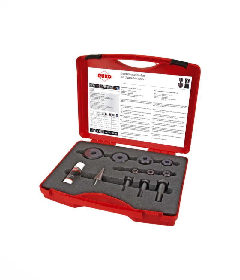 Ruko Csavaros lemezlyukasztó (lemezroppantó) 7+5 részes készlet, 3 pontos kivágással, max. 4 mm anyagvastagságig. Csavaros lemezlyukasztó készlet: 7 Csavaros lemezlyukasztó: Ø 16,5 (M 16) – 20,4 (M 20 / PG 13,5) – 25,4 (M 25) – 32,5 (M 32) – 40,5 (M 40) – 50,5 (M 50) + 63,5 mm (M 63); + 1 Kúpos lemezfúró, HSS, 2-es méret; + 1 Vágópaszta 30 g; + 1 Tartalékcsavar MF 10 x 1,0; + 1 Tartalékcsavar MF 12 x 1,5; + 1 Tartalékcsavar MF 16 x 1,5.