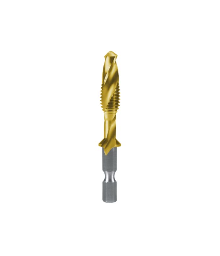 Kombinált gépi menetfúró bit-szárral zsákfurat és átmenő furathoz, hosszú kivitel. Menetoldalak: hátraköszörülve. Szár: 6.35 x 27.0 mm. A kombinált menetfúró ideálisan alkalmas lemez megmunkálásához jobbos és balos forgásirányú akkumulátoros fúrógéppel. A menet előtt csigafúró (fúrószár) található. Egy műveletben: maglyuk fúrás csigafúró (fúrószár)val, menetvágás, menet sorjázás, menet tisztítás (visszahúzásnál). HSS-TiN: alkalmas ötvözetlen és ötvözött acélokhoz 900 N/mm² szilárdságig, temperöntvényhez ill. színes- és könnyűfémekhez. Csomagolási egység: egyenként, műanyag csomagolásban.