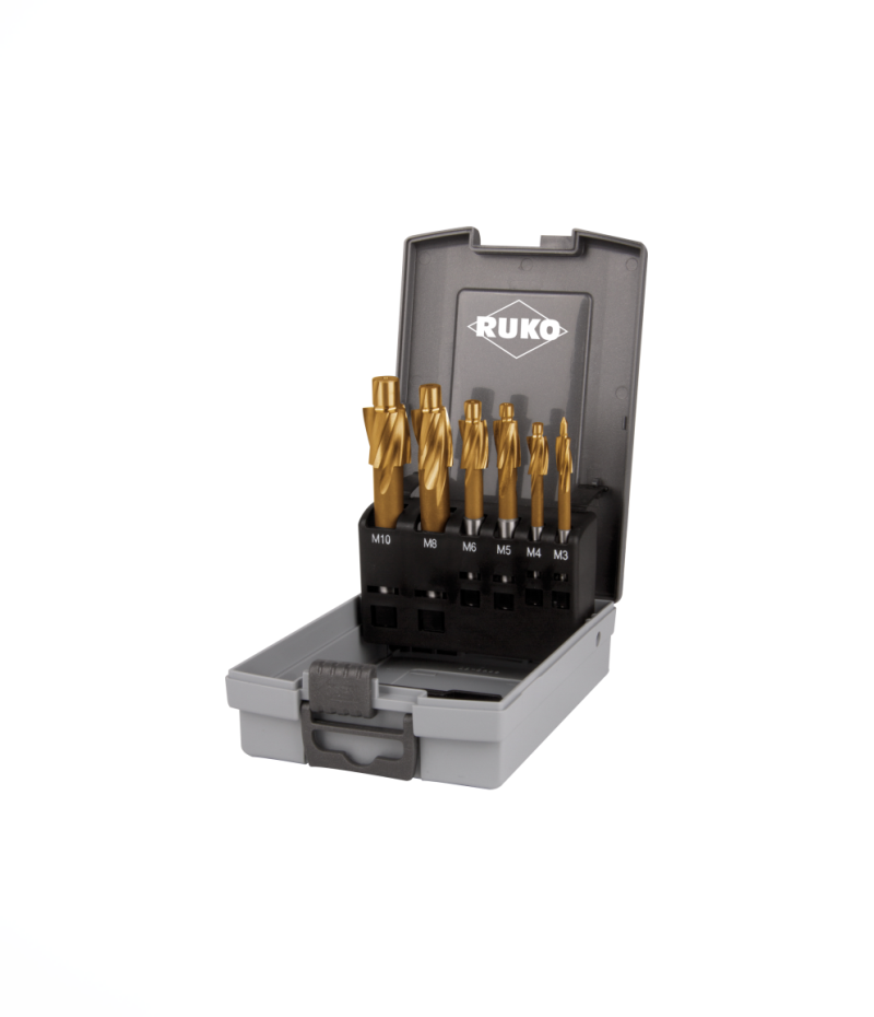 Ruko Hengeres szárú csapos kúp- és sorjázó süllyesztő 6 részes készlet, fix vezetőcsappal, menetes magfurathoz, DIN 373, 180°, HSS-TiN, M3; M4; M5; M6; M8; M10, 102452TRO