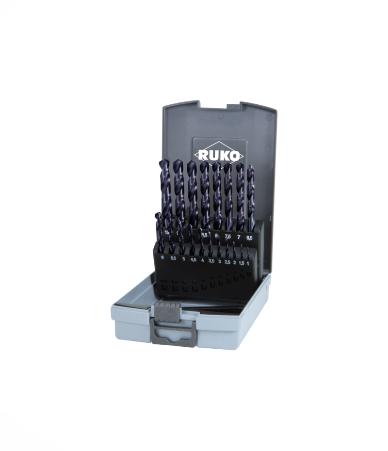 Ruko hengeres szárú csigafúró (fúrószár) 19 részes készlet, DIN 338 VA típus HSSE-Co8 TiAIN, jobbos, csúcsszög 130°, spirálszög 36°, tűrés h8, Ø 1,0 mm – 10,0 mm x 0,5 mm, 281214EFRO