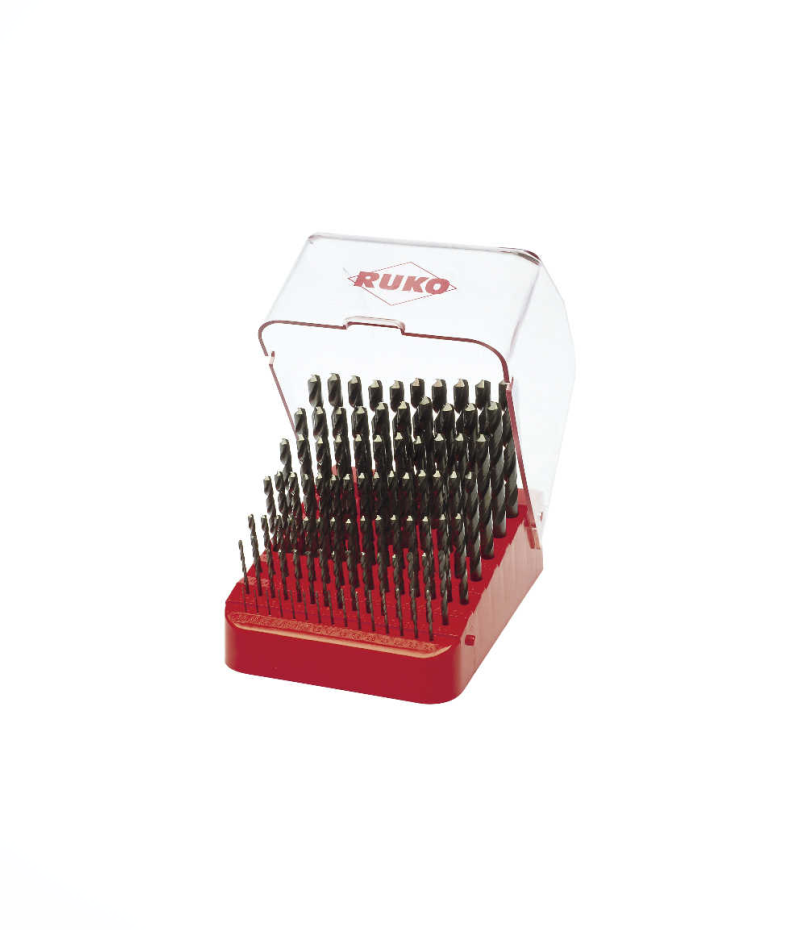 Ruko hengeres szárú csigafúró (fúrószár) 91 részes készlet, DIN 338, N típus, HSS-G, jobbos, csúcsszög 118°, spirálszög 25-30°, tűrés h8, Ø 1,0 mm – 10,0 mm x 0,1 mm, 214223