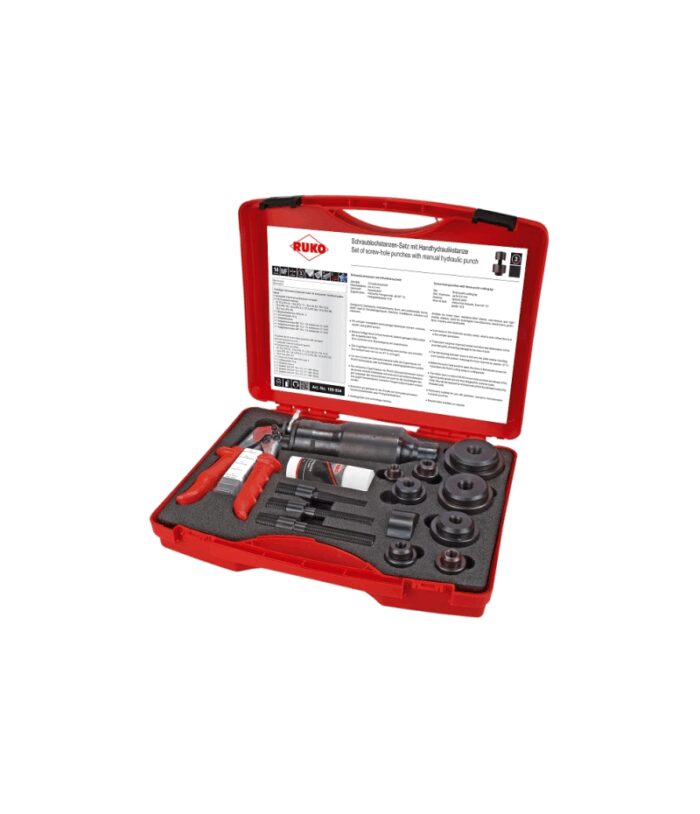 Ruko Kompakt kézi hidraulikus lemezlyukasztó (lemezroppantó) 8+6 részes készlet, műanyag kofferben. 1 Kompakt hidraulikus kézi lyukasztó: 8 Csavaros lemezlyukasztó. Ø 15,2 (PG 9) – 18,6 (PG11) – 20,4 (M 20 / PG 13,5) – 22,5 (PG 16) – 28,3 (PG 21) – 37,0 (PG 29) – 47,0 (PG 36) + 54,0 mm (PG 42). 1 Kúpos lemezfúró, HSS, 2-es méret. 1 Vágópaszta 30 g. 1 Távtartó persely. 1 adaptercsavar MF 10 x 1,0 befogó 3/4″ UNF. 1 adaptercsavar MF 12 x 1,5 befogó 3/4″ UNF. 1 adaptercsavar MF 16 x 1,5 befogó 3/4″ UNF. Húzóerő 50 kN.