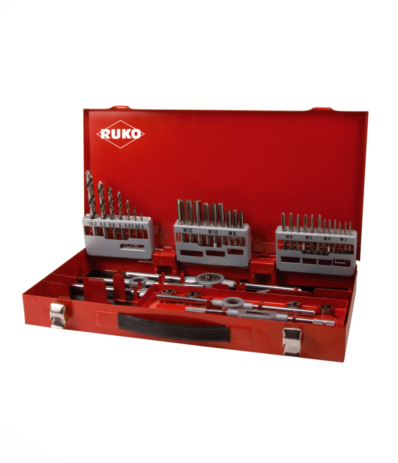 Kézi menetfúró készlet Nagy teljesítményű gyorsacélból. 44 részes menetvágó szerszám készlet: 1-1 db 3 részes kézi menetfúró készlet M DIN 352 M 3 – M 4 – M 5 – M 6 – M 8 – M 10 – M 12; + 7 csigafúró DIN 338, N típus, Ø 2,5 – 3,3 – 4,2 – 5,0 – 6,8 – 8,5 – 10,2 mm; + 7 menetmetsző M DIN EN 22568 M 3 – M 4 – M 5 – M 6 – M 8 – M 10 – M 12; + 5 menetmetsző hajtókar DIN 225; 20,0 x 5,0 mm – 20,0 x 7,0 mm – 25,0 x 9,0 mm – 30,0 x 11,0 mm – 38,0 x 14,0 mm; + 2 hajtókar DIN 1814 1 és 2 méret; + 1 csavarhúzó + 1 menetsablon. Átmenő furathoz és zsákfurathoz ötvözetlen és enyhén ötvözött acélokban, temperöntvényben ill. színes- és könnyűfémekben. A menetet három műveletben vágja ki. A metrikus és metrikus finommenet menettűrése DIN ISO 13 szerint belső menet előállításához. Csomagolási egység: ipari fémkazettában.