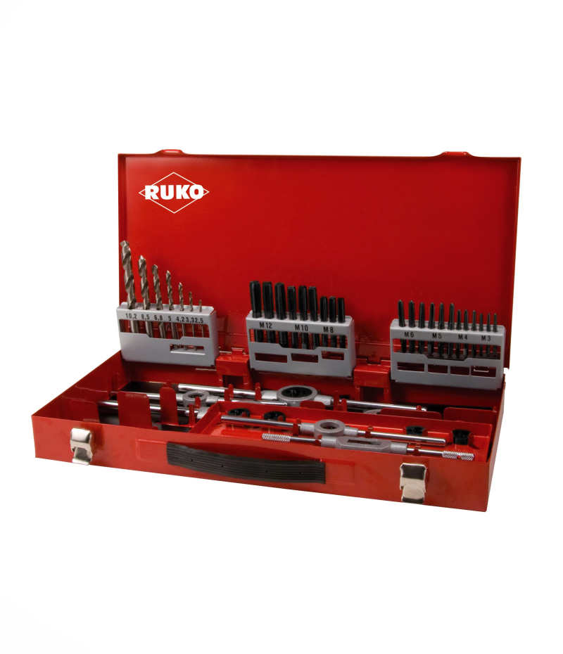 HSSE-Co 5 (5 %-os kobalttartalmú, köszörült gyorsacél). 44 részes menetvágó szerszám készlet: 1-1 db 3 részes kézi menetfúró készlet M DIN 352 M 3 – M 4 – M 5 – M 6 – M 8 – M 10 – M 12; + 7 csigafúró DIN 338, N típus, Ø 2,5 – 3,3 – 4,2 – 5,0 – 6,8 – 8,5 – 10,2 mm; + 7 menetmetsző M DIN EN 22568 M 3 – M 4 – M 5 – M 6 – M 8 – M 10 – M 12; + 5 menetmetsző hajtókar DIN 225; 20,0 x 5,0 mm – 20,0 x 7,0 mm – 25,0 x 9,0 mm – 30,0 x 11,0 mm – 38,0 x 14,0 mm; + 2 hajtókar DIN 1814 1 és 2 méret; + 1 csavarhúzó + 1 menetsablon. Átmenő furathoz és zsákfurathoz ötvözetlen és enyhén ötvözött acélokban, temperöntvényben ill. színes- és könnyűfémekben. A menetet három műveletben vágja ki. A metrikus és metrikus finommenet menettűrése DIN ISO 13 szerint belső menet előállításához. Csomagolási egység: ipari fémkazettában.