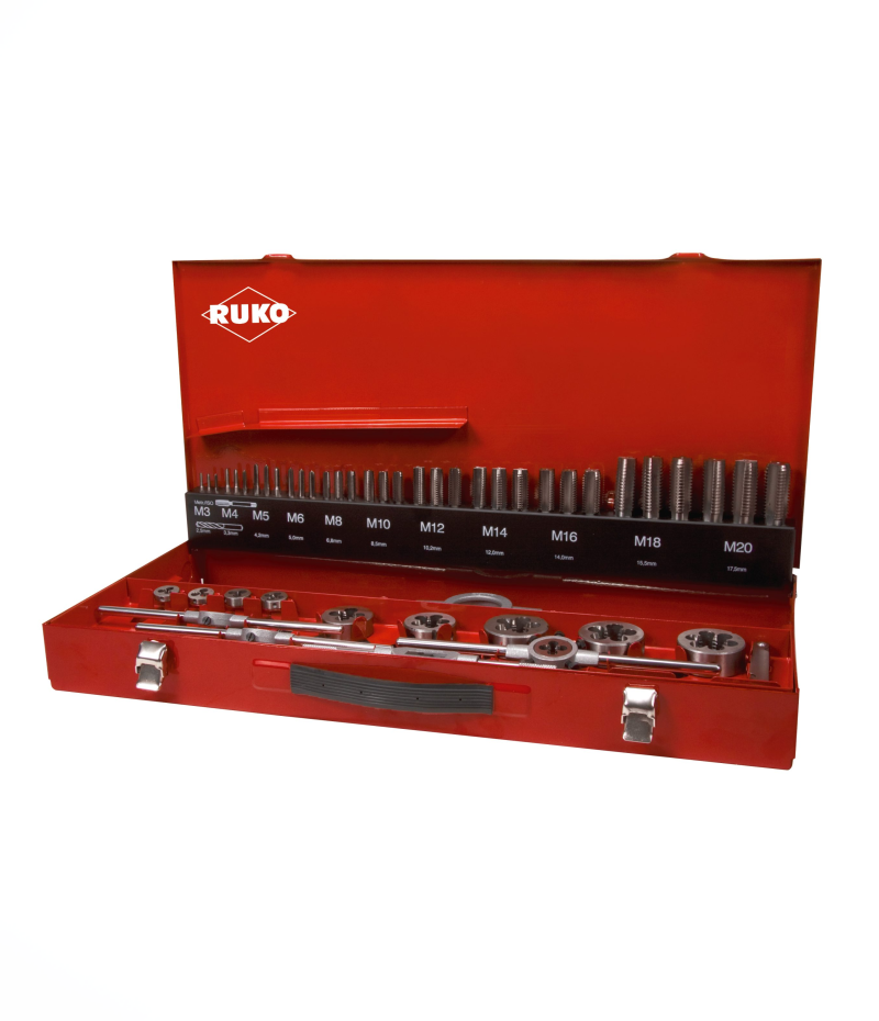 Kézi menetfúró készlet Nagy teljesítményű gyorsacélból. 54 részes menetvágó szerszám készlet: 1-1 db 3 darabos kézi menetfúró készlet M DIN 352; M 3 – M 4 – M 5 – M 6 – M 8 – M 10 – M 12 – M 14 – M 16 – M 18 – M 20; + 11 menetmetsző M DIN EN 22568; M 3 – M 4 – M 5 – M 6 – M 8 – M 10 – M 12 – M 14 – M 16 – M 18 – M 20; + 6 menetmetsző hajtókar DIN 225; 20,0 x 5,0 mm – 20,0 x 7,0 mm – 25,0 x 9,0 mm – 30,0 x 11,0 mm – 38,0 x 14,0 mm – 45,0 x 18,0 mm; + 2 hajtókar DIN 1814 1 és 3 méret; + 1 csavarhúzó; + 1 menetsablon. Átmenő furathoz és zsákfurathoz ötvözetlen és enyhén ötvözött acélokban, temperöntvényben ill. színes- és könnyűfémekben. A menetet három műveletben vágja ki. A metrikus és metrikus finommenet menettűrése DIN ISO 13 szerint belső menet előállításához. Csomagolási egység: ipari fémkazettában.