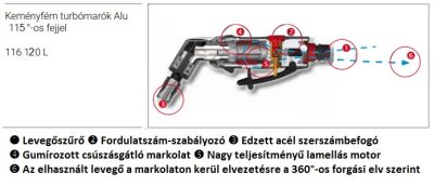 17.725 Ft (13.957 Ft + áfa)Ruko pneumatikus csiszológép, rövid kivitel, 90°-os fejjel, 113L/min, 6,2 bar, G 1/4″ csatlakozás, 25000 r.p.m, 6-os patronnal, 116110L