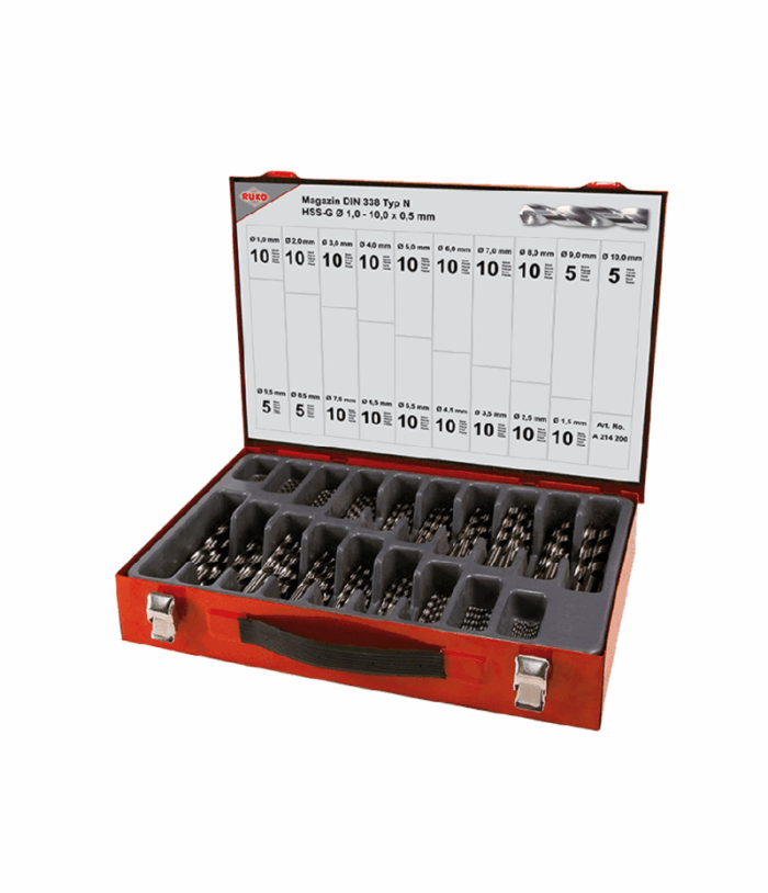 Ruko ULTIMATECUT fúrószár (csigafúró) készlet, Ø1mm-10mm x 0.5mm, HSSCo5, DIN338, 19 részes, FLOWSTEP® lépcsőzetes csúccsal, ipari műanyag kazettában, 259214ERO