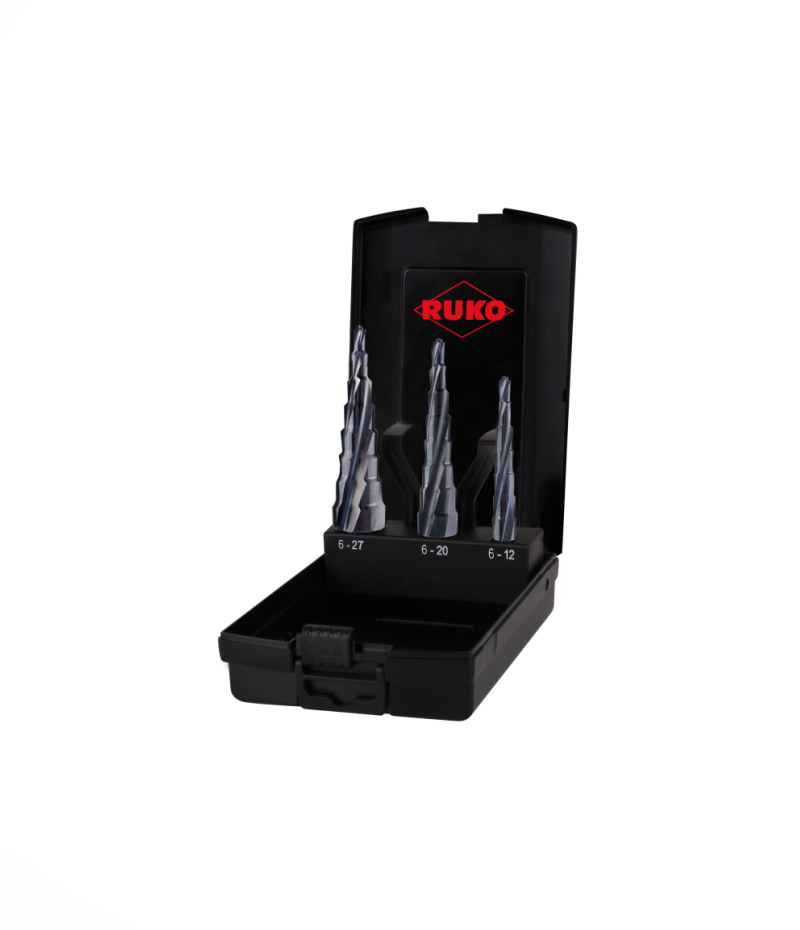 Ruko ULTIMATECUT 3 részes lépcsős fúró készlet, HSS RUnaTEC, spirálhornyú, Turbo fúrószár négy vágóéllel, 6,0 – 12,00 Ømm, 6,0 – 20,00 Ømm, 6,0 – 27,00 Ømm, 101 087 PRO
