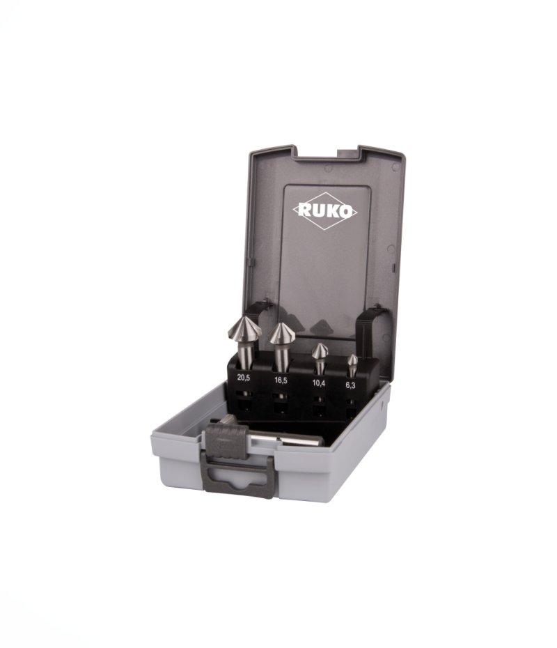 Ruko ULTIMATECUT Hengeres szárú kúp- és sorjázó süllyesztő 5 részes készlet, DIN 335, C alak, 90°, HSSE-Co5, 3 vágóéllel, Ø 6,3 – 10,4 – 16,5 – 20,5 – 25,0 mm, 102154ERO