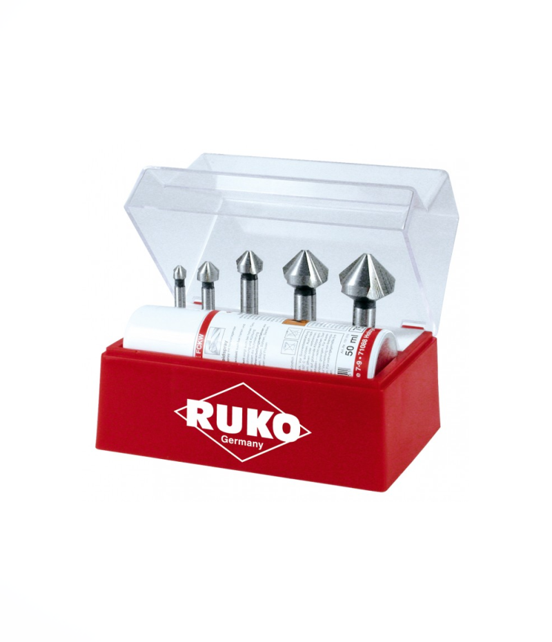 Ruko ULTIMATECUT Hengeres szárú kúp- és sorjázó süllyesztő 5+1 részes készlet, DIN 335, C alak, 90°, HSSE-Co5, 3 vágóéllel, vágópasztával, Ø 6,3 – 10,4 – 16,5 – 20,5 – 25,0 mm, 102142E