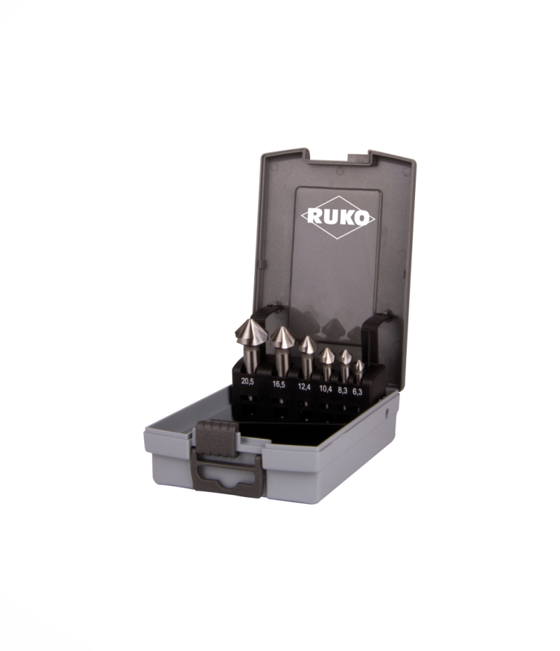 33.183 Ft (26.128 Ft + áfa)Ruko ULTIMATECUT Kúp- és sorjázó süllyesztő 6 részes készlet, DIN 335, C alak, 90°, HSS, 3 vágóéllel, Ø 6,3 – 8,3 – 10,4 – 12,4 – 16,5 – 20,5 mm, 102 790 RO