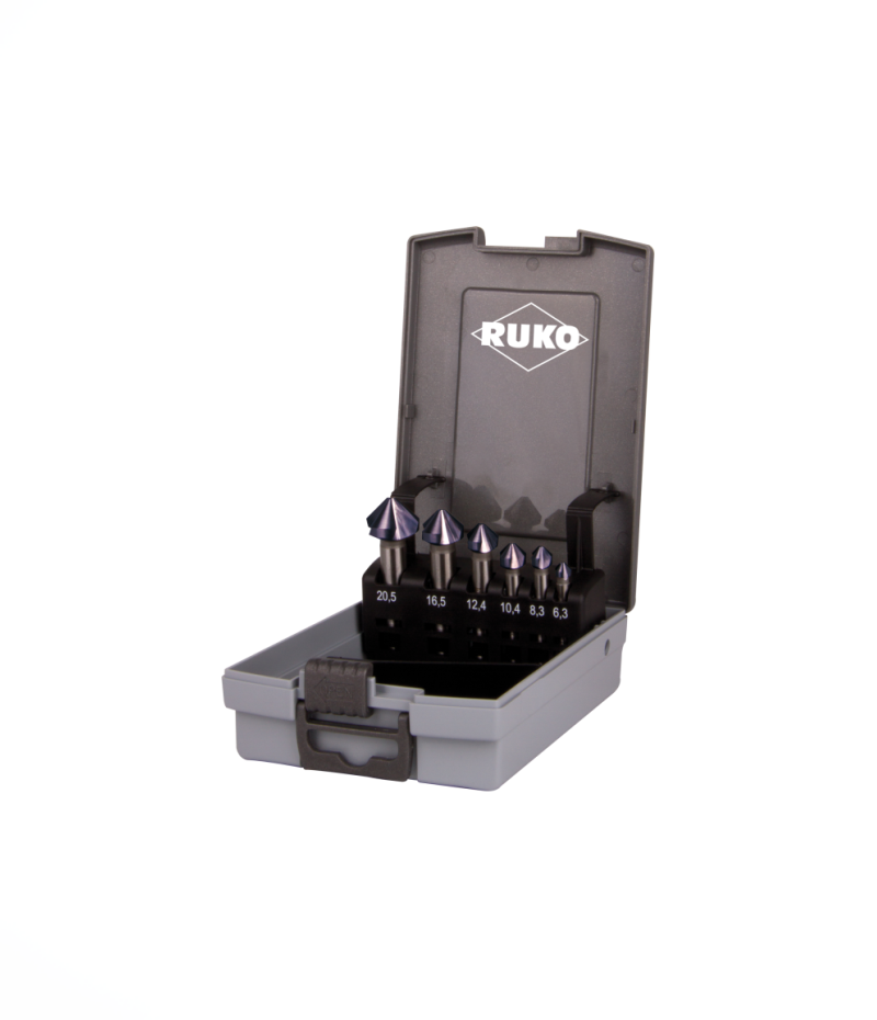 Ruko ULTIMATECUT Hengeres szárú kúp- és sorjázó süllyesztő 6 részes készlet, DIN 335, C alak, 90°, HSS-TiAIN, 3 vágóéllel, Ø 6,3 – 8,3 – 10,4 – 12,4 – 16,5 – 20,5 mm, 102152FRO