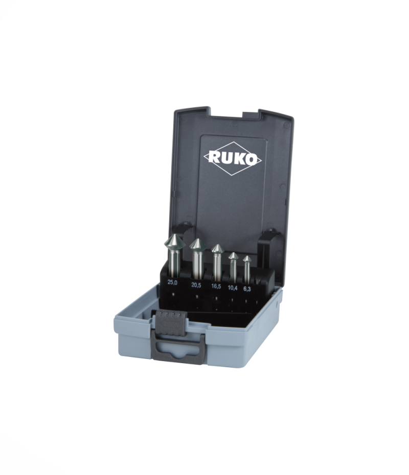 Ruko ULTIMATECUT Kúp- és sorjázó süllyesztő 5 részes készlet, DIN 335, C alak, 90°, HSSE-Co5, 3 vágóéllel, Ø 6,3 – 10,4 – 16,5 – 20,5 – 25,0 mm, 102 791 ERO