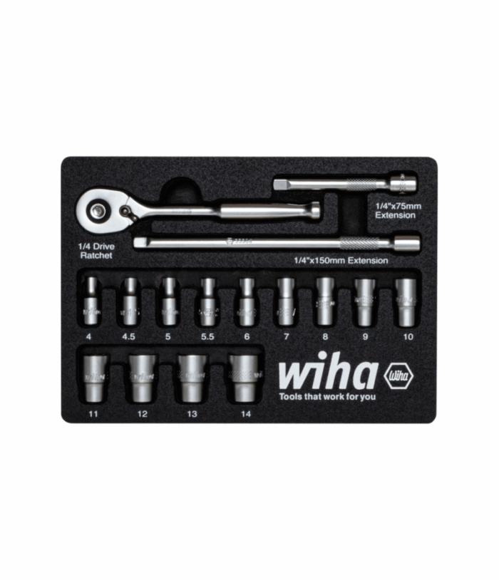 Wiha metrikus dugókulcs készlet racsnis hajtókarral, 1/4″ befogással, 4-14 mm, 17 részes, habszivacs tartóban.