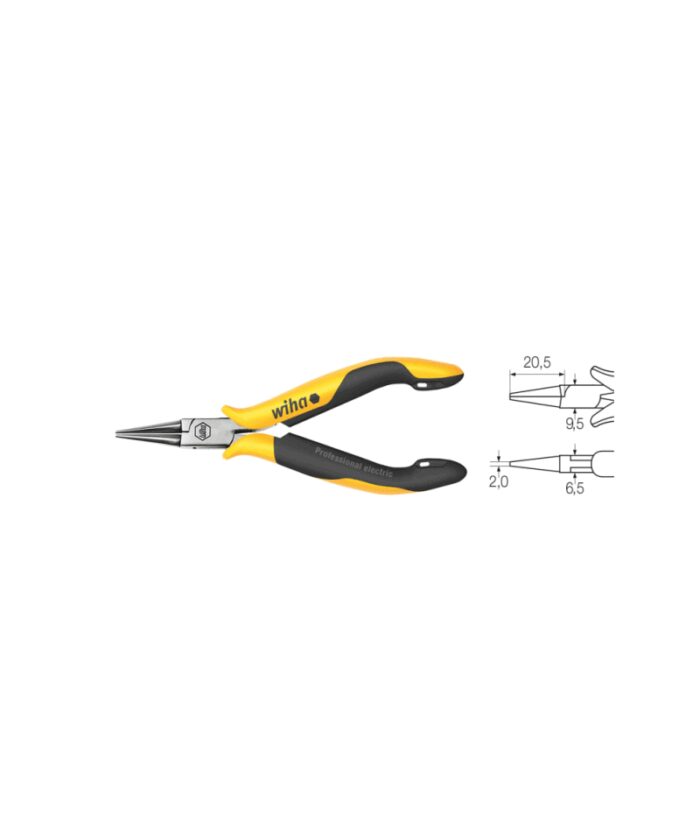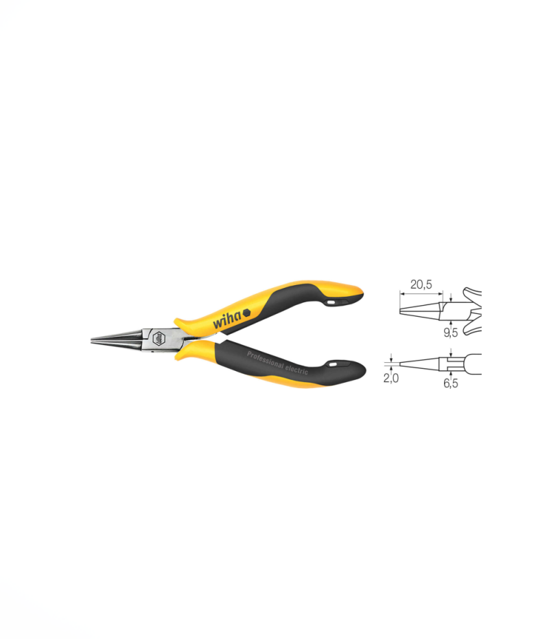 Wiha Professional ESD műszerész kerek csőrű fogó, kerek, rövid pofák, krómozott, 20,5 mm-es vágóéllel, DIN ISO 9655. IEC 61340-5-1. Finom, félkör alakú heggyel, nyitórugóval. Sima fogófelületekkel. C45 szénacélból. Főként finom megfogási és hajlítási munkálatokhoz.