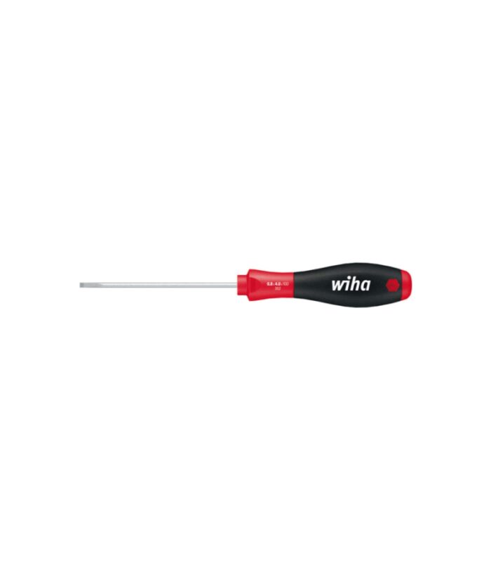 Wiha SoftFinish lapos (sliccelt) csavarhúzó kerek pengével, pengével azonos méretű keskeny heggyel a mélyen fekvő csavarokhoz, bliszteres csomagolásban, 4,5 x 125 mm, 43380