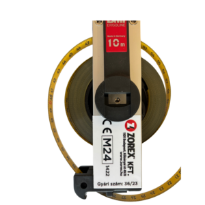 ZOREX Mérőszalag, acél, 10m/mm, fém mérősúllyal ellátott, OMH hitelesített, nyeles 305014010A s+h I.o rögzítő (szorító) és fémdoboz nélkül.
